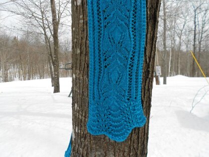 Knit this toasty scarf with its frosty lace pattern stitch. Lovely frost fronds run up the center of this scarf which is bordered with a simple lace stitch that’s easy to work. The bottom border is begun with the easy ripple stitch which makes a nice curvy beginning. There are written as well as charted instructions to quickly knit up this scarf!
