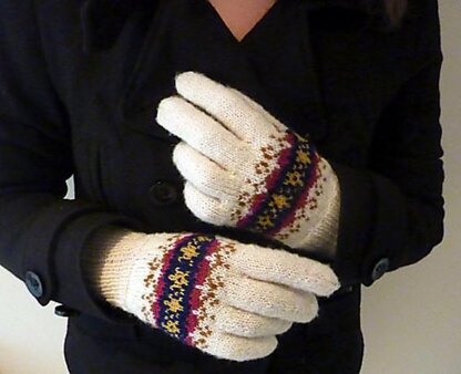 Just the thing for using up scrap yarn! These thrifty little gloves have an original stranded pattern over the main body of the hand to pretty them up. There is also an afterthought thumb for simplicity.