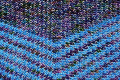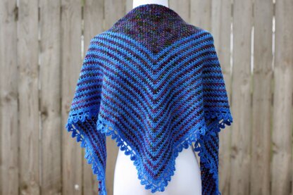 Blue Magic is a two-color triangular shawl worked in linen stitch. Fingering weight yarn is worked on a larger hook to create fabric with a nice drape, and the density of the stitch pattern makes for a warm, cushy shawl. The shawl is finished with a simple, delicate lace edging. The pattern is written using American crochet terms and has both a chart and written instructions for the edging. This pattern was tech edited by Chaitanya Muralidhara.