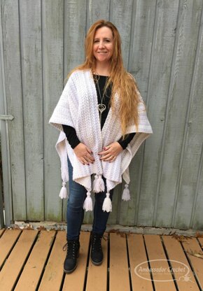 This ruana / blanket wrap is like wearing your favorite blanket when you’re on the go. Pattern is one size, but one size will fit most.