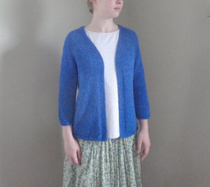 Lightweight slip on cardigan in a brilliant sapphire blue baby alpaca, with 3⁄4 raglan sleeves and a cute back gather section.