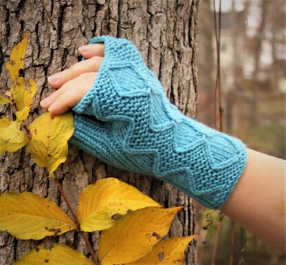 Brrrr…It’s getting cold out there! Banish those grey skies with cozy fingerless gloves in cheerful sky blue. These fingerless gloves feature a twist stitch chevron pattern on the front, and ribbing on the back. I call the asymmetrical thumb gusset and the stretchy ribbing on the palm a Goldilocks fit: not too loose, not too tight, just right! Worsted or Aran weight yarn makes this a quick knit--I made mine in a weekend!