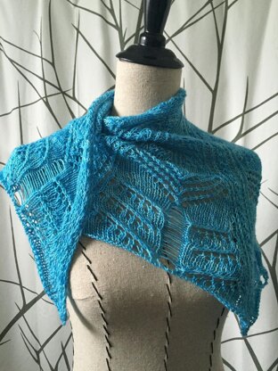 The shawl has 6 repeating panels which shape it into a deep crescent. The sample shawl was blocked with the wingspan tips pointing up in a “U” shape. You may also block the wingspan straight if preferred. The final rows drop stitches. If you like the look without dropping stitches you can skip this step. The result will be a more modest curve to the bottom edge.