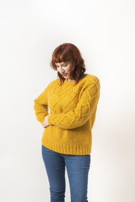 Blueberry Pie is a cozy, top-down, circular-yoke pullover in worsted weight yarn. It has just enough cables, bobbles, and textures to make for a fun and engaging knit, as well as clever details and modification instructions for two body shapes/lengths and multiple sleeve adjustments to insure a good fit.