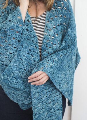 The Bluebird shawl is crocheted with gorgeous hand-dyed Mineville DK merino wool, resulting in a shawl with weight and warmth, yet a delicate feel due to the lacy stitch. The shawl is designed to fit around the neck and hang comfortably over or wrap around the shoulders. Worked with a 5mm hook, this project works up quickly despite its size.