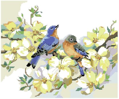 By Nancy Rossi. Romantic and classic, this charming design of a bluebird couple resting upon a dogwood branch in full bloom is a composition in elegance. Designer Nancy Rossi captures for all eternity the delicate balance of nature in bloom and the fleeting beauty of spring.