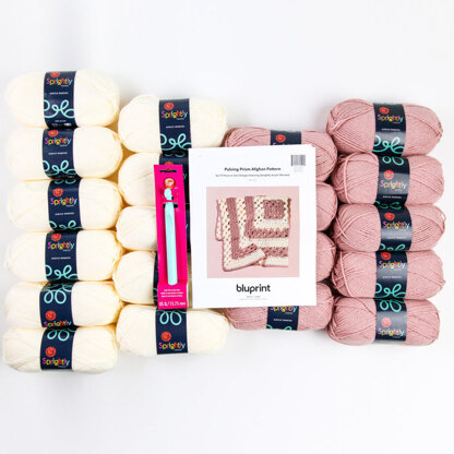 Create a colorful blanket perfect for adding a splash of color to your home with the Bluprint Pulsing Prism Afghan Crochet Kit. Worked with worsted weight Sprightly Yarns Acrylic Worsted held double and a classic granny square design, the Pulsing Prism Afghan will work up quickly. Crochet your own easy-care afghan with this kit! Finished blanket measures approximately 55" x 55".Kit Includes: Printed pattern, 11 skeins Sprightly Yarns Acrylic Worsted in Ecru, 9 skeins Sprightly Yarns Acrylic Worsted in Misty Pink, Size Q (15.75mm) crochet hook ***Note that the video instruction link included in the pamphlet is no longer valid.