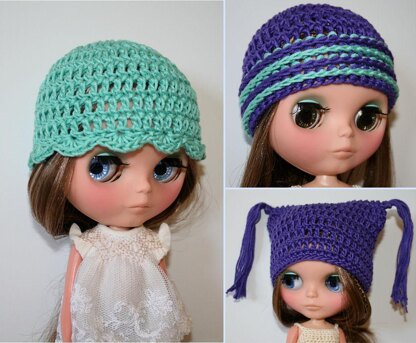 This is an adorable trio of hats to fit blythe and pullip sized dolls (can also fit 18" dolls but is a bit small) In this pattern there is a hat that uses post stitches and is striped using 2 different colors, another had has an adorable shell edging, and finally another one is a quirky hat with pointed corners and tassels.