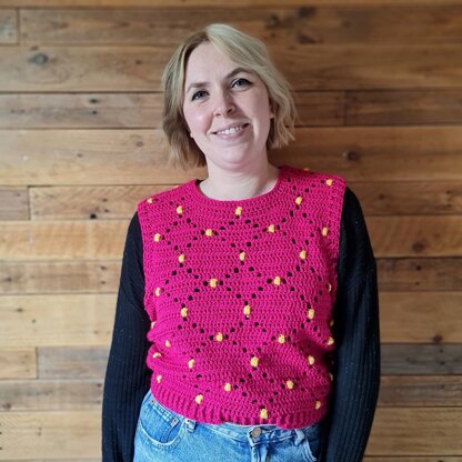 The Bobble and Chic vest is a cute and fun way to layer your crochet throughout the year. Made with DK yarn and with an eye-catching filet and bobble repeat, it's the perfect transitional piece for between seasons.