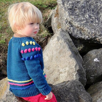 A top-down, seamless raglan worked in the round, this sweater was inspired by my eldest daughter's delight in watching a bumble bee in clover one sunny summer morning. Featuring oversized bobbles and garter ridge stripes, the sweater has lots of room for movement and climbing trees. It’s got just the right amount of color work to keep it interesting but not be tedious and a bit of texture too, just for fun!
