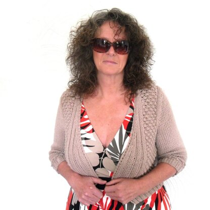 Feminine bolero. Main body is knitted in one piece in a scrumptious bobbly berry pattern. Shaped ribbing to the front allows the bolero to be worn fastened or loose. ¾ length sleeves are knitted separately in stocking stitch with pattern detail at the cuff.