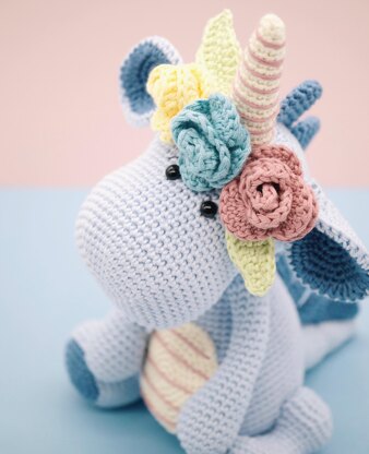 One size only: If made with a 2.5 mm crochet hook and 4-ply yarn she measures 20 cm tall from the tip of her horn to the base of her body.