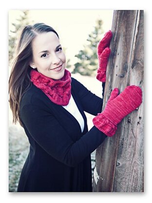 Bobbles and ruched stitching accent this comfy, cozy and fun to wear cowl and mitten set.