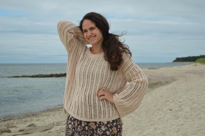 Boho Breeze is a fun summer sweater inspired by the beach. Knit from the bottom up in the round it features a split hemline, drop shoulder boxy shape, bell sleeves, and an allover lace pattern. Knit up in Quince and Co.’s cotton yarn, Willet, this sweater is enjoyable to knit and wear in the warmer months. The lace pattern is easy to memorize and engaging to knit. Boho Breeze’s allover lacy fabric is perfect for layering and mixing and matching into your spring and summer wardrobe!