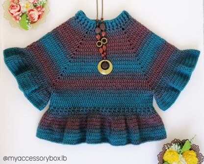 This pattern is very simple and easy to make, it only uses double crochet and chains. What makes this pattern special is the lovely ruffle waist and sleeves that give the final look a unique effect to the eye. ♥ Materials: 300 grams (2 skeins) Lionbrand’s Scarfie yarn 209 (Aqua) Crochet hook 6mm (J in US) Scissors Tapestry Needle Measuring tape ♥ Gauge: 10X10cm/4*4 inch. = 15 sts X 8 rows in dc. ♥ Level: Beginner-Intermediate ♥ Sizes: XS-S M-L XL-XXL XXXL
