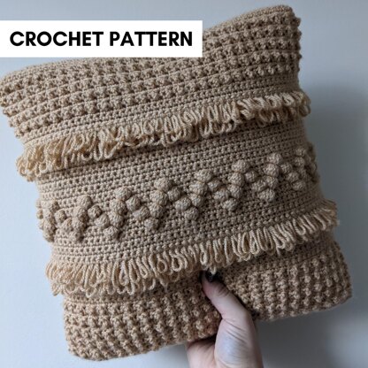 If you love boho style décor, this Boho Dreams square cushion pattern will fit your space perfectly. It has a fun, light and modern design which creates different textures against a neutral yarn colour. The downloadable PDF pattern includes: a schematic for the front panel, row by-row instructions, step by step stitch instructions with photos, accompanying stitch video tutorials and options and instructions for the cushion assembly. This is a bohemian style pattern which makes a beautiful cushion cover to fit a 14x14 inch cushion insert. Written in US terminology, the Boho Dreams crochet cushion pattern combines both beginner-friendly and more advanced crochet stitches to create different textures and designs. The stitches used are the bobble, treble, single crochet and loop stitches