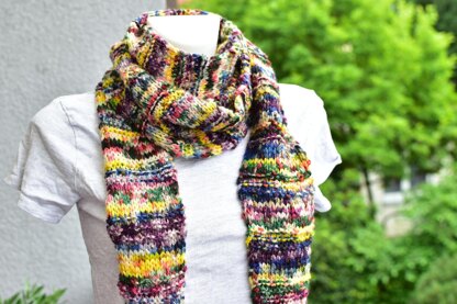 This is a knitting pattern for an extra long, boho style scarf knit in chunky yarn.