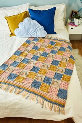 An easy, breezy bohemian blanket with gorgeous texture and fringing details. This colourful throw is made up of a 9 x 9 block of granny and rainbow motif squares, then granny stripes are added to two of the ends to create a rectangle shape. The piece is then embellished with fringing using all four yarn colours.