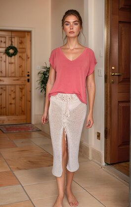 It’s made with three flat panels on a Sentro 48 (or Addi King, if that’s your machine), seamed up the sides. Then, I added a crocheted granny square waistband and finished everything with a drawstring and tassels, which not only makes it look cute but also helps with the fit.