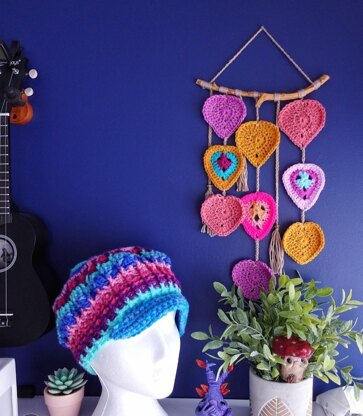 Hi everyone and welcome to the written pattern for the Boho Sweetheart Wall hanging. This pattern is a great way of using up some left-over yarn and creating a beautiful accessory for your craft room or a baby’s nursery. I have used dk weight yarn, but you can use whatever you wish, please bear in mind if you use a thinner yarn then your hearts will be smaller and if you use a thicker yarn your hearts will be bigger. Have fun crocheting this gorgeous wall hanging!