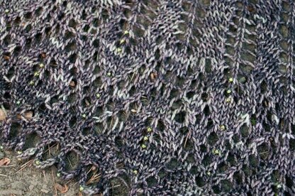 Bois features a simple woodgrain stitch pattern that grows organically into a deep, intricate leafy border. The shawl is knit from the top down in one piece and features optional beads and a decorative icord edging. Pattern is provided as charts and written directions.
