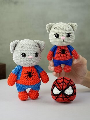 Boltmask Cat is a small amigurumi cat with a large round head, compact body, and simple limb shapes. The outfit is worked directly into the body with clean color blocks and an embroidered chest detail. The overall look is playful, neat, and beginner-friendly.