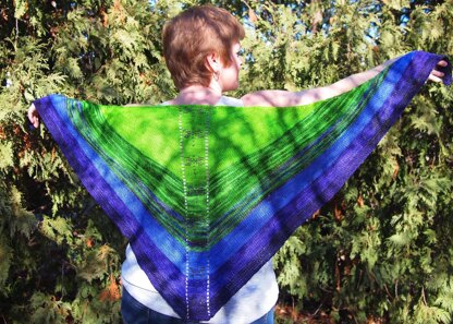 Bonne Fete to Dragonfly Fibers on ten years! Their birthday gradient, Dragonfly, inspired this design. It features a beaded dragonfly motif running down the spine; if you’re not up for beaded knitting, there is a non-beaded option. The shawl is kept simple to let the colorway shine!