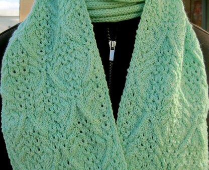 The scarf shown in the sample was made with Lorna’s Laces Shepherd Sport Weight yarn in colorway, Mint.