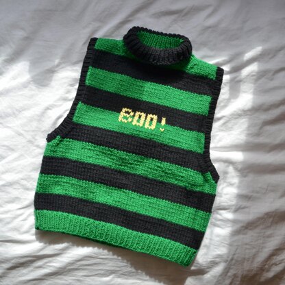 The Boo! Vest pattern is a simple, relatively chunky, striped knit. The pattern can be worked up in about a week and is written for beginner/advanced beginner knitter. The vest is knit up in 2 panels, all seamed together and then complet- ed with a neckline and armholes that are knit along the edge of the vest. Knitting charts are provided for the double stitch writing. The pattern includes sizes XS to 3XL and the sample is knit in size S.