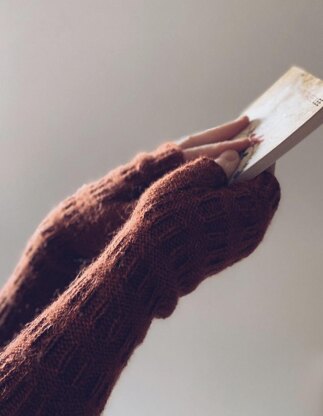 Featuring sections of reverse stocking stitch broken up by ribbed ‘bookshelves’, these mitts are worked inside out in the round for ease of knitting and are completed with twisted ribbing in the cuffs and a thumb gusset incorporated into the stitch pattern.
