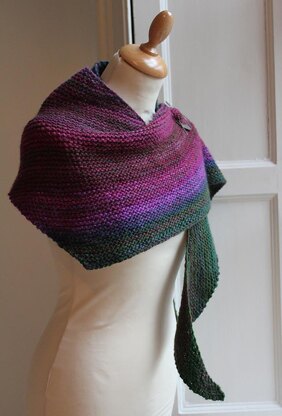 Boom! is a very simple asymmetric boomerang shawl, knit in garter stitch with increases and decreases. The shawl was designed with the intention of displaying a colour gradient in handspun yarns, prepared from commercially blended tops, but could be used with any commercial yarn. It would be ideal for variegated or gradient yarns. The basic knitting instructions could be used with any thickness of yarn & appropriate needles, to make any size shawl desired.