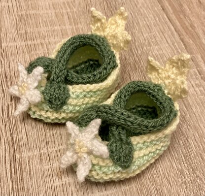 These Booties were designed for a doll to wear, but you could also knit these for a baby. Designed by Amanda Berry @fluffandfuzz, the booties are knitted in acrylic DK yarns on single pointed needles (not in the round). For confident beginners and above, other techniques used include casting on and off, knit, m1 increase and k2tog decrease, knit stripes, and a little seaming to finish.