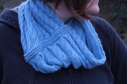 This cowl is knit with lace weight yarn held double, and features cables and pleats. It is ideally knit in a yarn with a slight halo and drape. Increases are worked on the purl sections between the cables; the work is then finished with pleats and a series of horizontal cords, before sewing the ends together.
