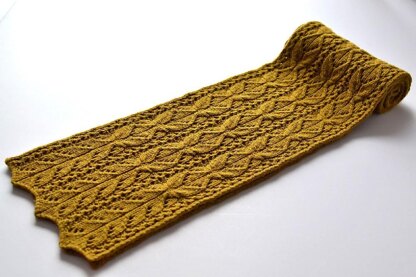 Inspired by the graceful curves of ripe pears, the Bosc Scarf's lush texture is simple to knit with easily-worked lace stitches and basic cables. Complementary lace borders and a clean edge treatment maintain sleek modern lines.