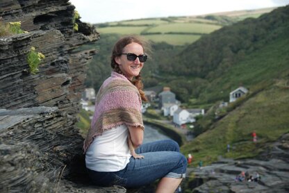 This shawl combines two yarns. The beautiful hand painted colors of the Pagewood Farms Yukon are showcased in areas of stockinette, while the Swan's Island Merino Fingering lends itself to the lace panels. A picot bind off frames the edge of the shawl and adds interest at the end of the last stockinette section.