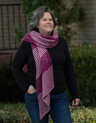 The Bosque Wrap is an elegant bias wrap, with playful stripes and a surprisingly easy leafy lace. “Bosque” is the Portuguese word for woods.