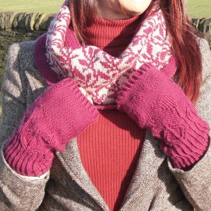 Knitted on DPN’s, these feminine gloves incorporate a row of leaves and flower buds that are knit around the glove above the twisted knit rib. The thumb gusset is an extension of one of the flower buds which opens up into a flower.