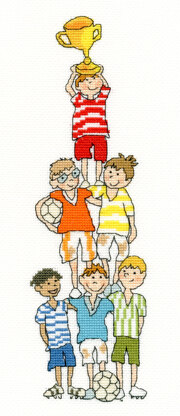 Your kit contains: 14 count white Zweigart Aida, pre-sorted stranded cottons, needle, stitch diagram and instructions. Finished size 13cm by 30cm. This kit uses full cross stitches, back stitch and French knots. There are charts for a boys' team and a girls' team. You can also create your own mixed team – just use the players that you want!
