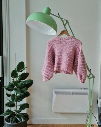 This sweater is a cute little cropped, mock neck jumper with balloon sleeves. It is knit bottom-up, in the round before being split and worked flat from the underarms. The shoulders are then bound off using a 3 needle bind-off to create a seamless body piece. The sleeves are then picked up and also knit in the round.