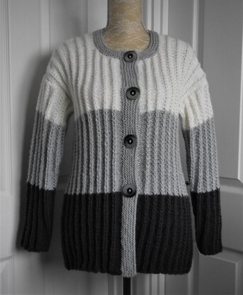 Here is a stylish colour block cardigan in a wide fisherman's rib. Theis creates not only a pleasing texture, but also real cosiness.