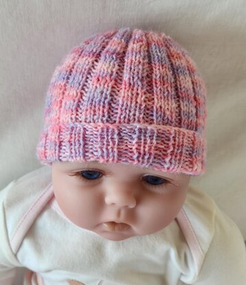 This 4ply Beanie has a 2x2 rib turn-up brim then increases out to a 2x3 rib. This design will suit either a baby girl or boy.