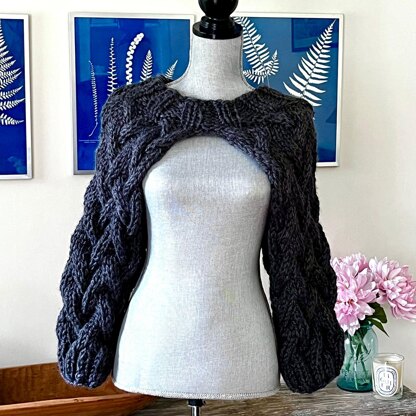 Bolero, shrug, whatever you call it, it’s SO GOOD! Chunky, squishy and super chic. It’s similar to a capelet, with a chunky ribbed neckband and killer cables that flair out over your shoulders ending in three quarter length sleeves and the option to make them longer.
