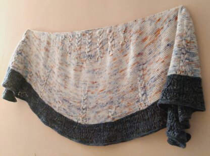 This is a light crescent shaped shawl which is mainly a mixture of squishy garter and interspersed braid style cables, that unravel down opening into small sections of lacework, through the body of this wrap into a twisted rib-based lace border to finish it off. It has a relatively swift rate of increase to form the shape, with 4 stitches being increased on each (RS) row and 2 on each (WS) row throughout the pattern. It uses nearly 3 skeins of Fingering weight yarn, 2 for the main body & 1, preferably tonal or solid colour, for the lace border.