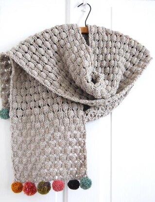 This cozy scarf features a stitch motif often referred to as Berry in a Box, a relatively simple bobbly texture that is easily achieved through knits, purls, yarn overs, and decreases. The ends of the scarf are punctuated with whimsical pom poms in a variety of colors…such a fun way to use up the leftover odds and ends in your knitting basket!
