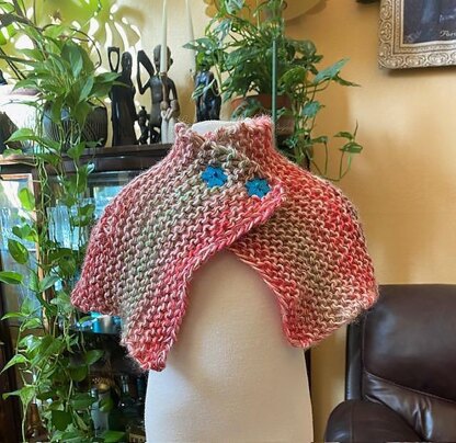 Inspired by Outlander series , The capelet is knit in garter stitch . It is an easy to follow pattern for intermediate knitters, designed for a maximum of glamor with a minimum of complications, especially for anyone who wants a quick and fancy project. Finished measurement: Measure straight line neck area : 33 cm, 13” Measure straight line bottom area : 56 cm, 22” Supplies needed: • Single point or circular knitting needles in sizes 8 mm ( US 11 ), long enough to hold 40 stitches • Yarn : I knitted with two different collors : 1/2 skein Lion Brand “ Landscape” 70m , 80 y 1/2 skein Nako Vals, 120 , 130 y 2 buttons at your choice , 15 mm diameter This is my own version, designed and knitted by me.