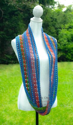 The Brianna is a colorful and beautifully textured cowl that can be worn long or wrap it around for warmth. This design demonstrates the striking effect of combining self-striping yarn with a complimenting solid colored yarn.