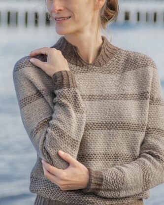 Brickstone Sweater is a lightweight, textured sweater with many flattering details. The interesting stripe sequence is achieved with very simple colourwork, which gives it a sophisticated look. You always work with only one colour per row/round. The smart opening at the front of the collar is a visual trick, which makes your neck appear longer. An unusual ribbing pattern underlies the texture.