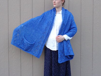 A comfortable and all around wrap, with pockets and a subtle leaf lace design adding a touch of interest to the overall simplicity. The lace design is worked across the pocket section and then continues vertically at the edges.