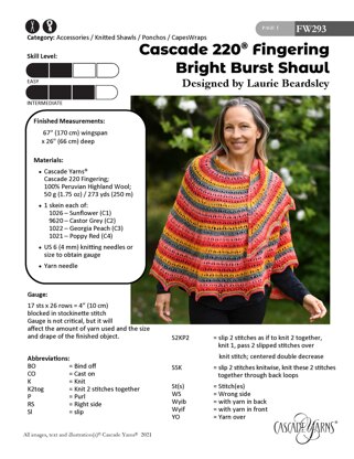 Bright Burst Shawl in Cascade 220® Fingering - FW293 - Downloadable PDF is a free Intermediate Knitting pattern by Laurie Beardsley, available as a Downloadable PDF and includes instructions in English. Super fun to make, this pattern could be your next masterpiece!