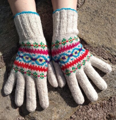 This is a pattern for handknit fair-isle gloves with instructions for full and half fingered gloves. I have given colourways for Jamieson & Smith jumper weight yarn and Jamieson's of Shetland spindrift (listed in description here is Jamiesons of Shetland yarn but the pattern also lists Jamieson and Smith alternatives). The colourways are very similar but the J & S version has a light fawn as the background and the Jamieson's version has a light grey as the main colour. The gloves are constructed with an afterthought thumb. Because the pattern on the back of the hand and the palm are the same and the fingers are plain I think this would be good if you'd like to have a go at gloves for the first time. They are also excellent for using up little left overs of yarn and experimenting with colour.